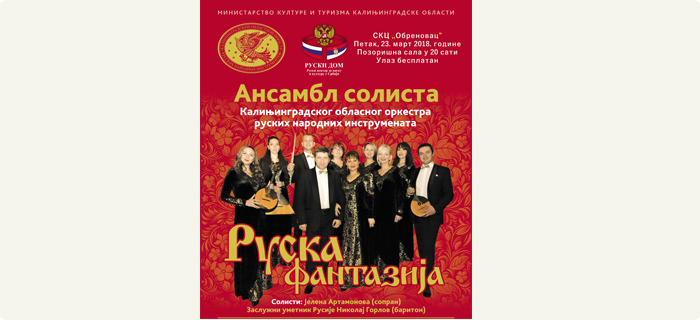 Koncert Kalinjingradskog orkestra ruskih narodnih instrumenata, „Ruska fantazija“, nastupiće za obrenovačku publiku u petak, 23. marta 2018. godine u 20.00 sati u Pozorišnoj sali SKC „Obrenovac“.