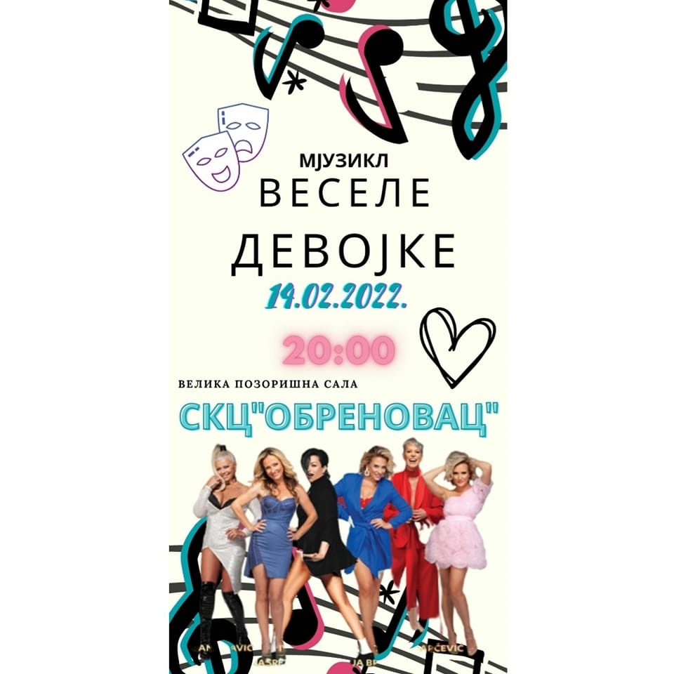 Мјузикл “Веселе Девојке“ биће одржан у уторак 14. фебруара са почетком у 20:00 часова у позоришној сали Спортско-културног центра ”Обреновац”.