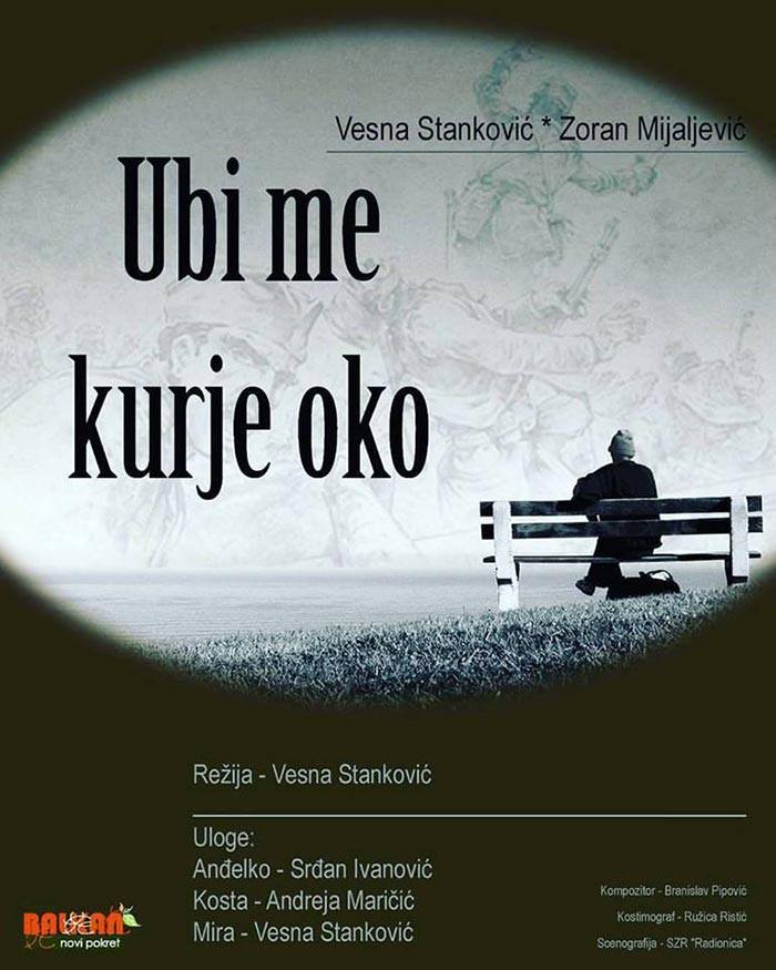 Позоришна представа „Уби ме курје око“ биће одиграна у суботу, 10. марта 2018. године у 20.00 сати у Позоришној сали СКЦ „Обреновац“.