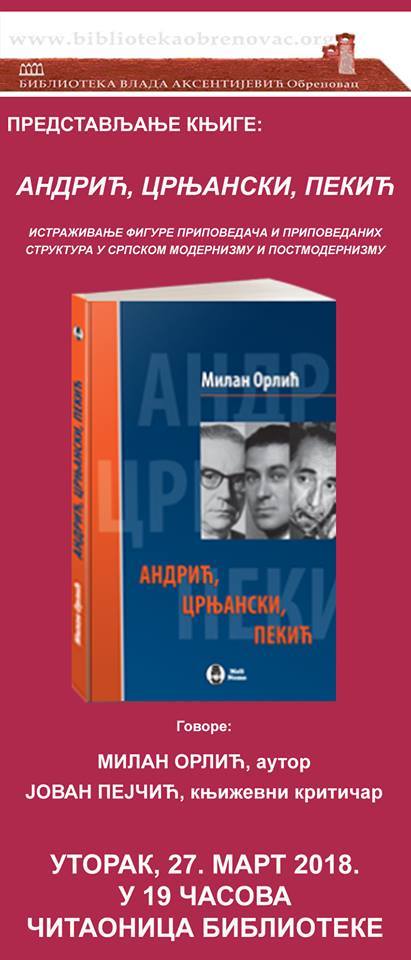 У уторак, 27. марта 2018. године у читаноци Библиотеке од 19.00 часова представљамо књигу „Андрић, Црњански, Пекић: приповедне структуре српског (пост)модернистичког романа“ Милана Орлића“.