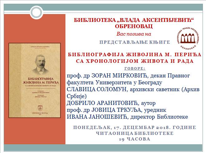 У понедељак, 17. децембра 2018. године у читаоници Библиотеке “Влада Аксентијевић“ од 19.00 часова представићемо књигу “Библиографија Живојина М. Перића: са хронологијом живота и рада“, која је објављена као заједничко издање Библиотеке “Влада Аксентијевић“ и Правног факултета Универзитета у Београду. Аутор књиге је Добрило Аранитовић, а уредник проф. др Јовица Тркуља.