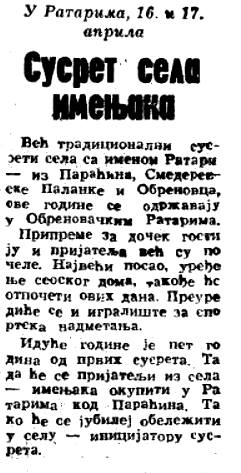 У селима под називом Ратари (Обреновац, Смедеревска Паланка и Параћин) се од 1972. године одржава манифестација Ратаријада.