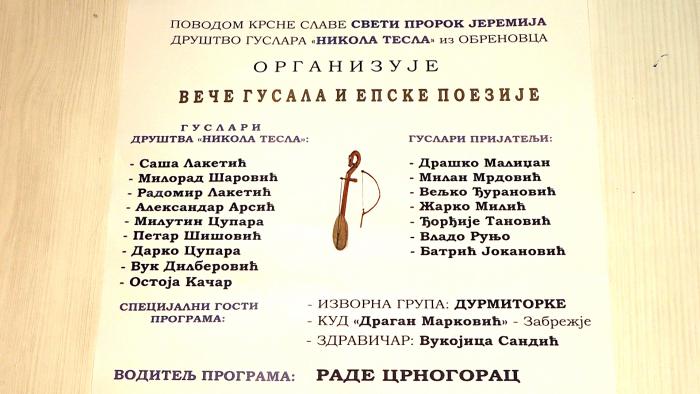 Друштво гуслара “Никола Тесла“ из Обреновца организује вече гусала и епске поезије у великој позоришној сали Спортско клтурног центра “Обреновац“ у уторак, 14. маја са почетком у 19.00 сати.